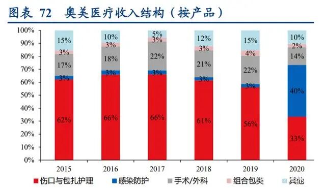 近年来公司积极开拓国内市场,丰富产品种类。公司国内收入占比从2014年的16%提升至2019年的32%,国内渠道开拓成效显著。公司业务主要划分为五大板块,基础伤口护理、手术感控、压力治疗与固定、造口及现代伤口护理、感染防控。2014-2019年,公司基础伤口护理业务收入占比明显下降,手术感控等新兴业务发展迅速。
