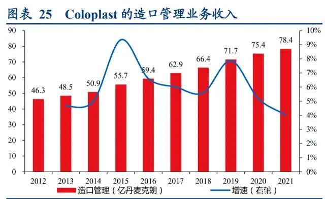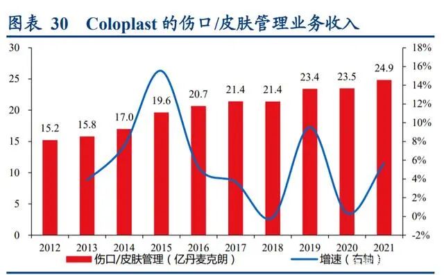 至此,公司形成了目前的四大业务板块——造口护理、失禁管理、泌尿外科、伤口/皮肤管理。公司各个业务板块具有较好的协同效应。公司将造口袋制造商的经验拓展到生产尿袋和导尿管等。造口管理产品也包括与造口底盘接触的皮肤的护理,进而衍生到伤口和皮肤管理业务。泌尿外科业务与公司的失禁管理业务同属于一个科室,只是销售渠道分别在院内和院外,公司的泌尿外科加上失禁管理业务能提供治疗大多数泌尿系统疾病的产品。
