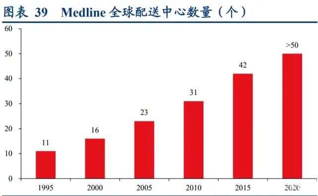 3)强大的分销能力。低值耗材产品品类繁多、终端客户分散,分销能力是低值耗材企业重要的竞争力。麦朗在全球有强大的分销体系。截至2020财年,麦朗在全球有超过50个配送中心,麦朗在美国的配送中心总面积已达到2300万平方英尺。麦朗在美国拥有自己的运输车队,运货卡车数量从2001年的22辆增加至2020年的1200多辆,2020财年运输车队运输的商品销售额占麦朗美国收入的近75%。2018年麦朗投入5亿美元启动HRI(Healthcare Resilience Initiative)计划,计划的内容包括新建配送中心、增强生产能力、信息系统升级等,目的是提高供应链的效率,确保及时向客户交付产品。